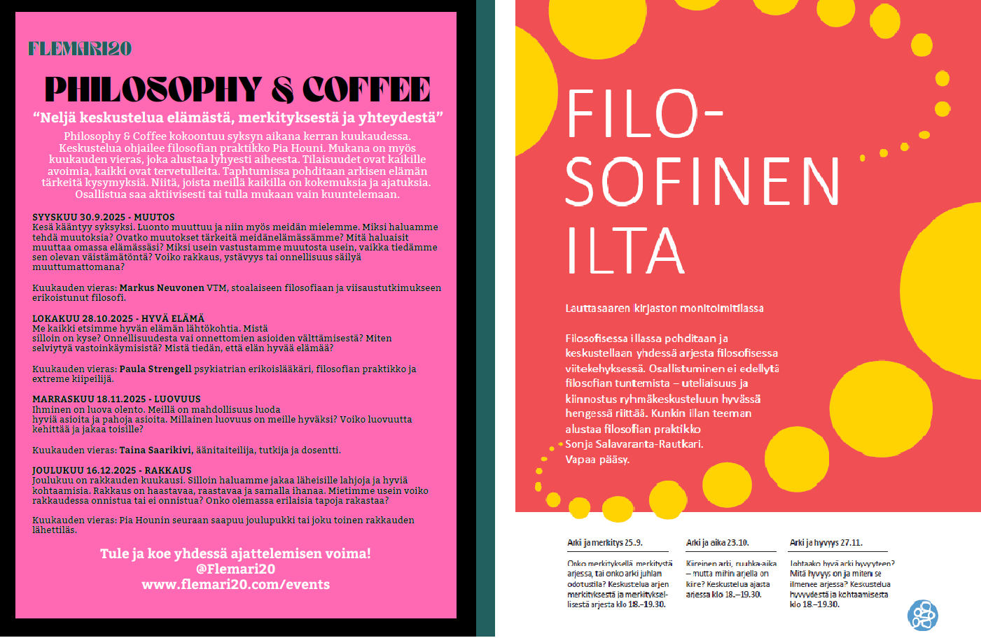 Fiven syksyn ohjelma on pyörähtänyt käyntiin. Tervetuloa mm. Filocafé-keskusteluihin, lukupiiriin ja viettämään Maailman filosofiapäivää marraskuussa!
