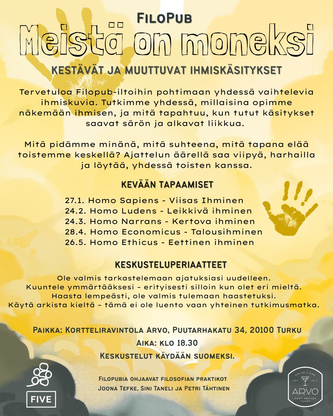 Tervetuloa FiloPub-iltoihin pohtimaan yhdessä vaihtelevia ihmiskuvia. Tutkimme yhdessä, millaisina opimme näkemään ihmisen, ja mitä tapahtuu, kun tutut käsitykset saavat särön ja alkavat liikkua.